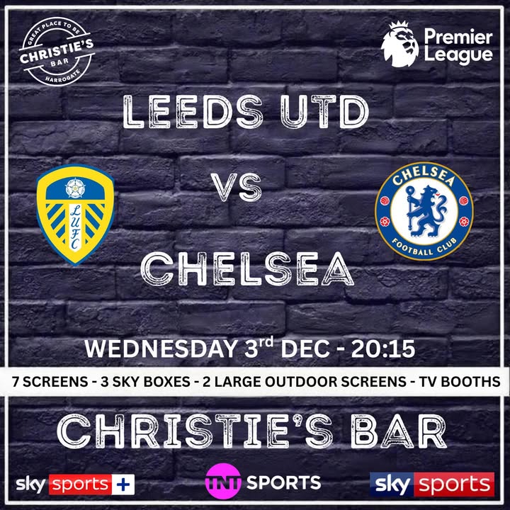 Huge game for #LeedsUtd tonight. Can #TheWhites get a much needed 3 points from high flying #Chelsea #Arsenal look to extend their lead at the top of the #PremierLeague against #Brentford Can #Liverpool finally kick into form and take the 3 points from #Sunderland Showing all three games live with sound Great value drink offers served all day every day 🍷 🍺 🍹 🥃 𝗠𝗶𝘅 𝗻 𝗠𝗮𝘁𝗰𝗵 selected lager / cider bottles 2 for £7.50 𝗲𝘃𝗲𝗻 𝗯𝗲𝘁𝘁𝗲𝗿 𝘃𝗮𝗹𝘂𝗲 4 for £14 𝐂𝐨𝐜𝐤𝐭𝐚𝐢𝐥𝐬 - any 2 for £12 🍹 𝗕𝗼𝗺𝗯𝘀 - any 2 for £6 💣 𝐅𝐥𝐚𝐯𝐨𝐮𝐫𝐞𝐝 𝗦𝗵𝗼𝘁𝘀 - any 4 for £6 🥃 𝐏𝐫𝐞𝐦𝐢𝐮𝐦 𝐬𝐡𝐨𝐭𝐬 - any 2 for £5 🍷 𝗗𝗼𝘂𝗯𝗹𝗲 𝘂𝗽 - spirits from only £2 🍸 #PremierLeague #Bar #GreatVibes #drinkoffers #BucketOfBeer #livesport #CrackingAtmosphere #WeLoveSport #livesportsvenue #greatplacetobe #LiveFootball #Tonight #CheapAsChips #drinkoffersharrogate #christiesharrogate