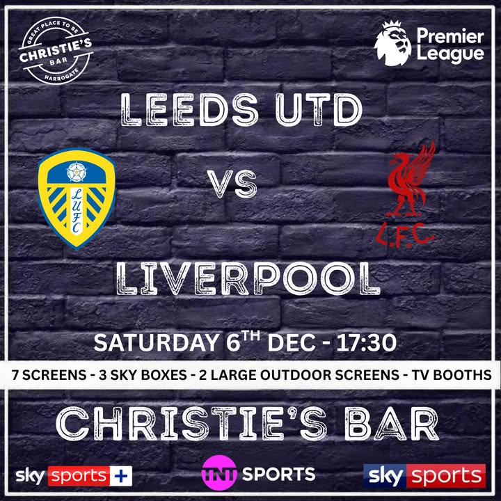 Can #SuperLeeds pull off another giant killing and take all 3 points from struggling #Liverpool Come for the goals, stay for the pints 🍺 Bring your mates, grab a seat, and let’s make some noise! 📍 Christie’s 🕠 Kick-off: 5:30pm 🍺 Great value drink offers, and proper match-day vibes. #LeedsUnited #LiverpoolFC #PremierLeague #FootyNight #Christiesharrogate #BeerGoals #MatchDayMadness #LiveandLoud on all screens