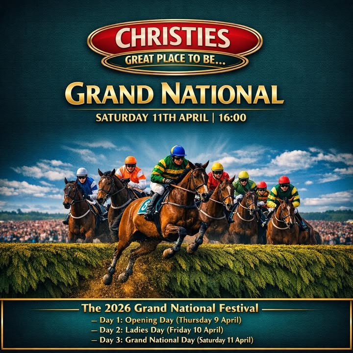 It’s 𝐆𝐑𝐀𝐍𝐃 𝐍𝐀𝐓𝐈𝐎𝐍𝐀𝐋 𝐃𝐀𝐘 and the horses aren’t the only ones flying. We’re talking 𝐛𝐢𝐠 𝐬𝐜𝐫𝐞𝐞𝐧𝐬, 𝐛𝐢𝐠 𝐬𝐡𝐨𝐮𝐭𝐬, 𝐛𝐢𝐠 𝐰𝐢𝐧𝐬 (𝐨𝐫 𝐝𝐫𝐚𝐦𝐚𝐭𝐢𝐜 𝐥𝐨𝐬𝐬𝐞𝐬). Grab a drink, pick a horse, pretend you know what “good form” means — it’s all part of the fun at 𝐂𝐇𝐑𝐈𝐒𝐓𝐈𝐄𝐒 🏇🔥 Try your luck on our 𝐒𝐰𝐞𝐞𝐩𝐬𝐭𝐚𝐤𝐞 - guaranteed to pick a non-runner 😤 - ask a member of staff for details