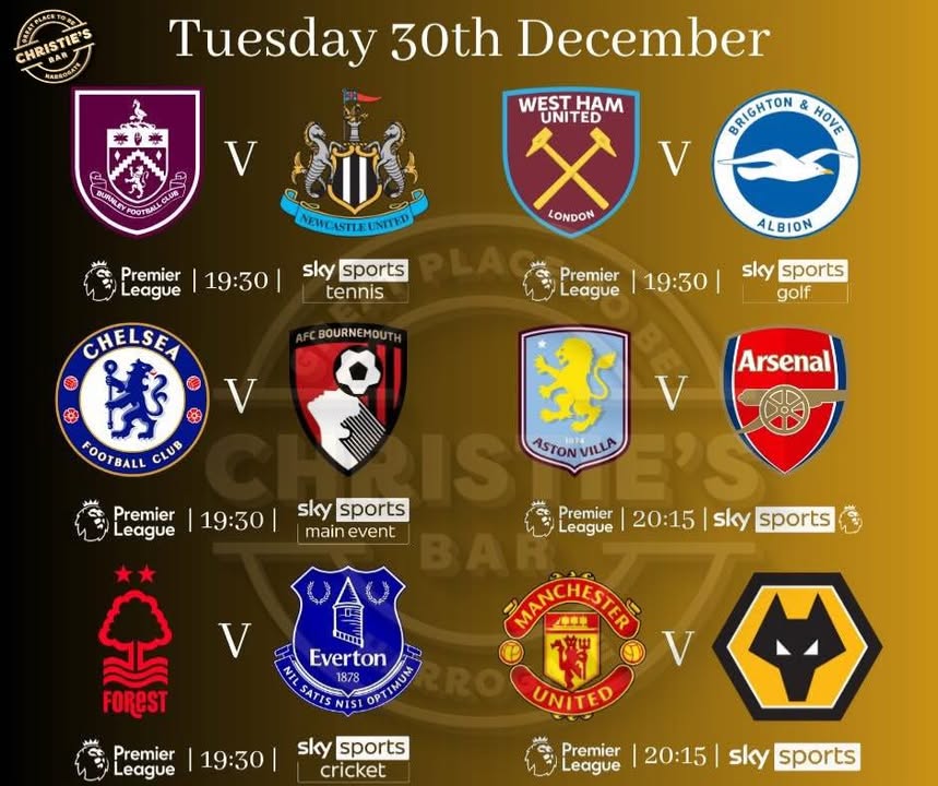 Premier League action this week! 🔥⚽ We’ve got a huge night of football coming up tomorrow, with all these games live: 🕢 7:30pm • Burnley v Newcastle United • Chelsea v AFC Bournemouth • Nottingham Forest v Everton • West Ham United v Brighton & Hove Albion 🕗 8:15pm • Arsenal v Aston Villa • Manchester United v Wolves Cold drinks, big screens & the best atmosphere 🍻⚽ Who are you backing? 👀