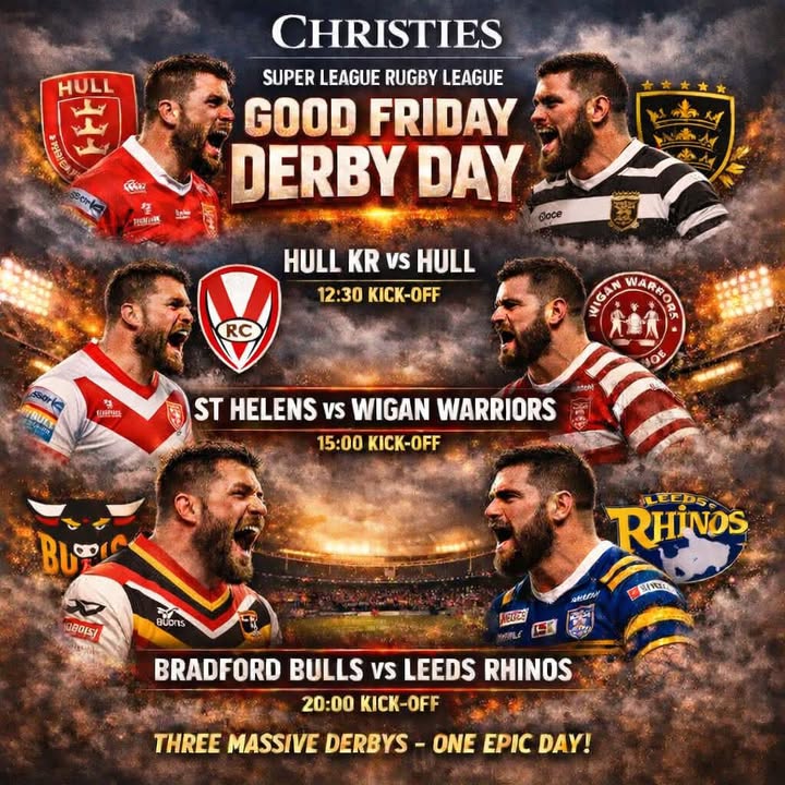 🔥 𝐆𝐎𝐎𝐃 𝐅𝐑𝐈𝐃𝐀𝐘 𝐃𝐄𝐑𝐁𝐘 𝐃𝐀𝐘 𝐚𝐭 𝐂𝐇𝐑𝐈𝐒𝐓𝐈𝐄𝐒 🔥 Three massive 𝐒𝐮𝐩𝐞𝐫 𝐋𝐞𝐚𝐠𝐮𝐞 clashes — all live on our screens! 🏉 𝐇𝐮𝐥𝐥 𝐊𝐑 𝐯𝐬 𝐇𝐮𝐥𝐥 — 𝟏𝟐:𝟑𝟎 🏉 𝐒𝐭 𝐇𝐞𝐥𝐞𝐧𝐬 𝐯𝐬 𝐖𝐢𝐠𝐚𝐧 𝐖𝐚𝐫𝐫𝐢𝐨𝐫𝐬 — 𝟏𝟓:𝟎𝟎 🏉 𝐁𝐫𝐚𝐝𝐟𝐨𝐫𝐝 𝐁𝐮𝐥𝐥𝐬 𝐯𝐬 𝐋𝐞𝐞𝐝𝐬 𝐑𝐡𝐢𝐧𝐨𝐬 — 𝟐𝟎:𝟎𝟎 Join us for an all‑day rugby feast, cold pints, and unbeatable atmosphere. 𝐓𝐡𝐫𝐞𝐞 𝐝𝐞𝐫𝐛𝐲𝐬. 𝐎𝐧𝐞 𝐞𝐩𝐢𝐜 𝐝𝐚𝐲. 𝐋𝐢𝐯𝐞 𝐚𝐭 𝐂𝐡𝐫𝐢𝐬𝐭𝐢𝐞𝐬. #SuperLeague #RugbyLeague #GoodFridayDerbyDay #ChristiesHarrogate #RugbyAtChristies