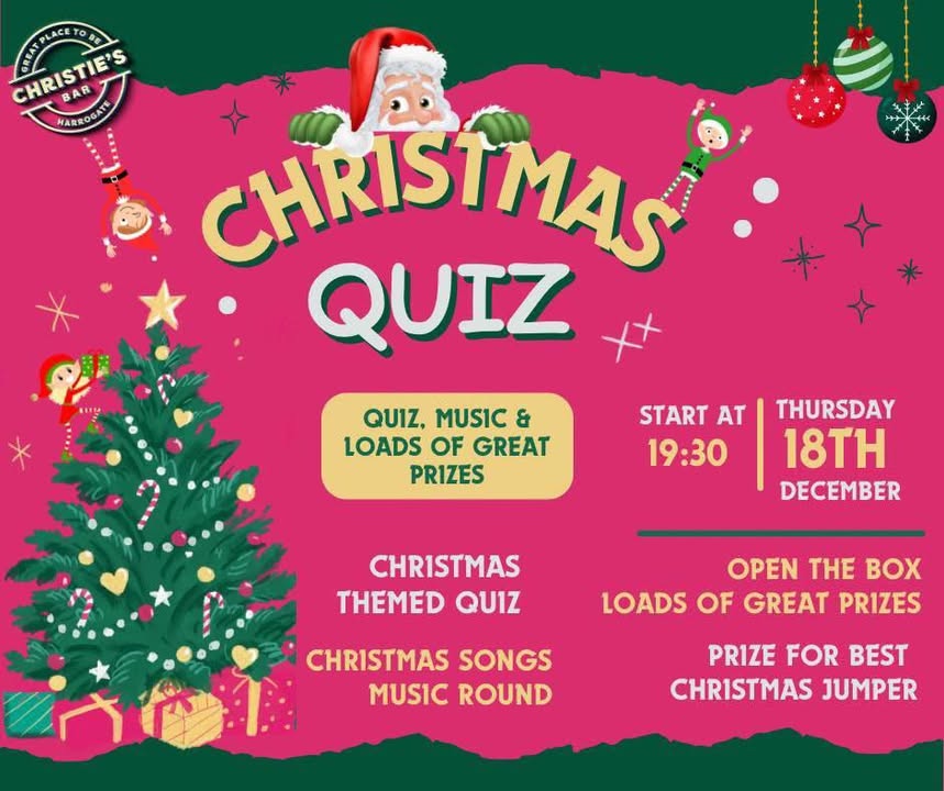 🚨 𝐒𝐚𝐯𝐞 𝐓𝐡𝐞 𝐃𝐚𝐭𝐞 🚨 👇👇👇👇👇👇👇👇👇👇👇👇👇👇👇 🎅🤶 MERRY QUIZMAS, YOU FILTHY ANIMALS! 🦌🍺 Dust off your ugliest Christmas jumper and drag your reindeer-loving mates to Christies legendary Christmas Quiz Night! 📅 Thursday 18th December 🕗 8pm (fashionably late elves will be fed to the Grinch) 🎄 Teams of up to 6 brain cells (combined) Expect rounds so festive they’ll make your tinsel tingle: Prizes include: 🥇 A turkey (not guaranteed to be dead) or we may leave this to the butchers 🦃 🥈 Booby prize so embarrassing you’ll want to win it 🥉 Eternal glory + first dibs on the mulled wine Book a table or just stumble in wearing antlers. Either way, bring your mates. cheer and zero shame. Let’s get absolutely elfed up! 🎉🍻 #ChristmasQuiz #GetYourTinselOut #PubWiserThanYourAverageElf #christiesharrogate #christmasquizharrogate