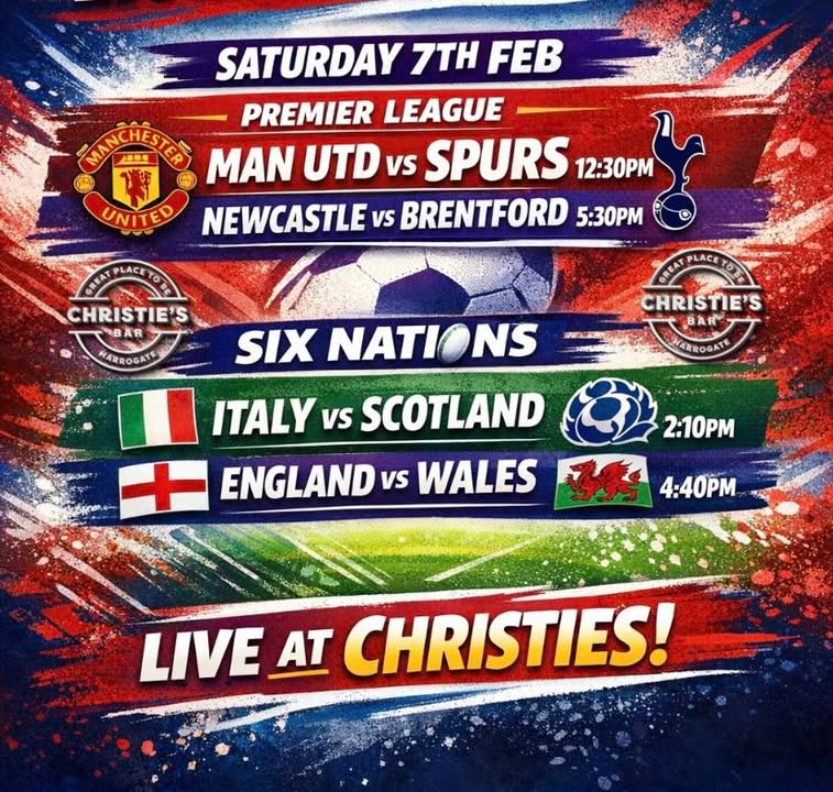 🔥🔥 𝐒𝐔𝐏𝐄𝐑 𝐒𝐀𝐓𝐔𝐑𝐃𝐀𝐘 𝐀𝐓 𝐂𝐇𝐑𝐈𝐒𝐓𝐈𝐄𝐒! 🔥🔥 Get ready for a 𝐦𝐚𝐬𝐬𝐢𝐯𝐞 day of live sport — back‑to‑back action, big screens, and the best atmosphere in town! ⚽ 𝐏𝐑𝐄𝐌𝐈𝐄𝐑 𝐋𝐄𝐀𝐆𝐔𝐄 𝐒𝐇𝐎𝐖𝐃𝐎𝐖𝐍𝐒 💥 𝐌𝐚𝐧 𝐔𝐭𝐝 𝐯𝐬 𝐒𝐩𝐮𝐫𝐬 – 12:30pm 💥 𝐍𝐞𝐰𝐜𝐚𝐬𝐭𝐥𝐞 𝐯𝐬 𝐁𝐫𝐞𝐧𝐭𝐟𝐨𝐫𝐝 – 5:30pm 🏉 𝐒𝐈𝐗 𝐍𝐀𝐓𝐈𝐎𝐍𝐒 𝐂𝐋𝐀𝐒𝐇𝐄𝐒 🔥 𝐈𝐭𝐚𝐥𝐲 𝐯𝐬 𝐒𝐜𝐨𝐭𝐥𝐚𝐧𝐝 – 2:10pm 🔥 𝐄𝐧𝐠𝐥𝐚𝐧𝐝 𝐯𝐬 𝐖𝐚𝐥𝐞𝐬 – 4:40pm 🍻 Ice‑cold drinks 🙌 Unbeatable vibes 📺 All the action LIVE Don’t just watch the games — 𝐅𝐄𝐄𝐋 them at 𝐂𝐡𝐫𝐢𝐬𝐭𝐢𝐞𝐬! 𝐁𝐫𝐢𝐧𝐠 𝐲𝐨𝐮𝐫 𝐦𝐚𝐭𝐞𝐬 𝐚𝐧𝐝 𝐦𝐚𝐤𝐞 𝐚 𝐝𝐚𝐲 𝐨𝐟 𝐢𝐭! 𝐆𝐫𝐞𝐚𝐭 𝐕𝐚𝐥𝐮𝐞 𝐃𝐫𝐢𝐧𝐤 𝐎𝐟𝐟𝐞𝐫𝐬 𝐀𝐥𝐥 𝐃𝐚𝐲 𝐄𝐯𝐞𝐫𝐲 𝐃𝐚𝐲 𝗠𝗶𝘅 𝗻 𝗠𝗮𝘁𝗰𝗵➖selected lager / cider bottles 2➖for➖£7.50 or 4➖for➖£14 𝐂𝐨𝐜𝐤𝐭𝐚𝐢𝐥𝐬 ➖ any 2 for £12 🍹 𝗕𝗼𝗺𝗯𝘀 ➖ any 2 for £6 💣 𝗕𝗼𝗺𝗯𝘀 ➖ any 2 for £6 💣 𝐅𝐥𝐚𝐯𝐨𝐮𝐫𝐞𝐝 𝗦𝗵𝗼𝘁𝘀 ➖ any 4 for £6 🥃 𝐏𝐫𝐞𝐦𝐢𝐮𝐦 𝐬𝐡𝐨𝐭𝐬 ➖ any 2 for £5 🍷 𝗗𝗼𝘂𝗯𝗹𝗲 𝘂𝗽 ➖spirits from only £2 🍸 #christiesharrogate #premierleague #sixnations2026 #livefootballharrogate #sixnationsharrogate