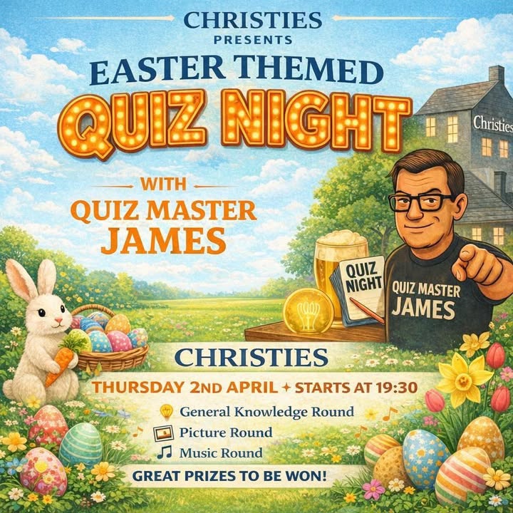 🐰✨ 𝐄𝐚𝐬𝐭𝐞𝐫 𝐓𝐡𝐞𝐦𝐞𝐝 𝐐𝐮𝐢𝐳 𝐍𝐢𝐠𝐡𝐭 𝐚𝐭 𝐂𝐡𝐫𝐢𝐬𝐭𝐢𝐞𝐬! 🐇 𝐘𝐨𝐮𝐫 𝐄𝐚𝐬𝐭𝐞𝐫 𝐰𝐞𝐞𝐤𝐞𝐧𝐝 𝐬𝐭𝐚𝐫𝐭𝐬 𝐡𝐞𝐫𝐞 👇👇👇 𝐓𝐡𝐢𝐬 𝐓𝐡𝐮𝐫𝐬𝐝𝐚𝐲 𝟐𝐧𝐝 𝐀𝐩𝐫𝐢𝐥 • 𝟏𝟗:𝟑𝟎 — join 𝐐𝐮𝐢𝐳 𝐌𝐚𝐬𝐭𝐞𝐫 𝐉𝐚𝐦𝐞𝐬 for a cracking evening of trivia, laughs, and great prizes! 🎶💡🖼️ Grab your mates, sip a pint, and hop into the fun — it’s the perfect way to get the Easter celebrations started at Christies! 🍻🌸🐣 #ChristiesBar #EasterQuiz #QuizNight #EasterFun #PubQuiz #SpringVibes #EasterAtChristies #christiesharrogate