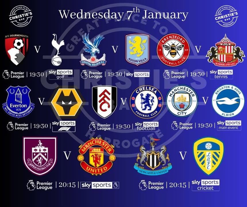 ⚽️𝐇𝐮𝐠𝐞 𝐰𝐞𝐞𝐤𝐞𝐧𝐝 𝐨𝐟 𝐏𝐫𝐞𝐦𝐢𝐞𝐫 𝐋𝐞𝐚𝐠𝐮𝐞 𝐅𝐨𝐨𝐭𝐛𝐚𝐥𝐥 ⚽️ 𝐒𝐚𝐭𝐮𝐫𝐝𝐚𝐲 𝟑𝐫𝐝 𝐉𝐚𝐧 🕧 12:30 – Aston Villa v Nottingham Forest 🕠 17:30 – AFC Bournemouth v Arsenal 𝐒𝐮𝐩𝐞𝐫 𝐒𝐮𝐧𝐝𝐚𝐲 𝟒𝐭𝐡 𝐉𝐚𝐧 🕧 12:30 – Leeds United v Manchester United (TNT Sports) 🕒 15:00 – Everton v Brentford (Sky Sports Golf) 🕒 15:00 – Fulham v Liverpool (Sky Sports Main Event) 🕒 15:00 – Newcastle United v Crystal Palace (Sky Sports Premier League) 🕒 15:00 – Tottenham Hotspur v Sunderland (Sky Sports Football) 🕠 17:30 – Manchester City v Chelsea (Sky Sports Main Event) 🍻 𝐁𝐢𝐠 𝐠𝐚𝐦𝐞𝐬, 𝐛𝐢𝐠 𝐚𝐭𝐦𝐨𝐬𝐩𝐡𝐞𝐫𝐞 – 𝐚𝐥𝐥 𝐋𝐈𝐕𝐄 𝐡𝐞𝐫𝐞 𝐚𝐭 𝐂𝐡𝐫𝐢𝐬𝐭𝐢𝐞𝐬 Great value drink offers served all day every day 🍷 🍺 🍹 🥃 𝗠𝗶𝘅 𝗻 𝗠𝗮𝘁𝗰𝗵 selected lager / cider bottles 2 for £7.50 𝗲𝘃𝗲𝗻 𝗯𝗲𝘁𝘁𝗲𝗿 𝘃𝗮𝗹𝘂𝗲 4 for £14 𝐂𝐨𝐜𝐤𝐭𝐚𝐢𝐥𝐬 - any 2 for £12 🍹 𝗕𝗼𝗺𝗯𝘀 - any 2 for £6 💣 𝐅𝐥𝐚𝐯𝐨𝐮𝐫𝐞𝐝 𝗦𝗵𝗼𝘁𝘀 - any 4 for £6 🥃 𝐏𝐫𝐞𝐦𝐢𝐮𝐦 𝐬𝐡𝐨𝐭𝐬 - any 2 for £5 🍷 𝗗𝗼𝘂𝗯𝗹𝗲 𝘂𝗽 - spirits from only £2 🍸 #ChristiesBar #christiesharrogate #PremierLeague #BucketOfBeer #LiveFootball #Bar #drinkspecials