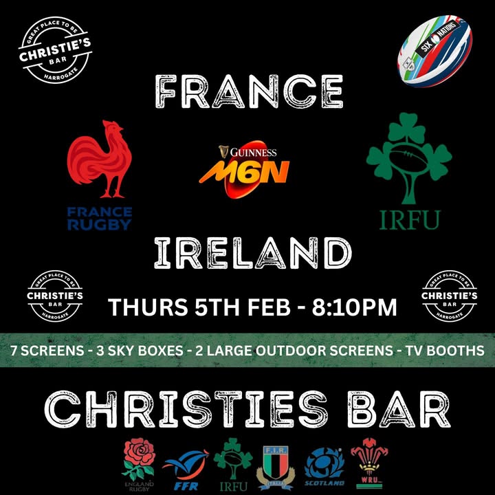 The 𝟐𝟎𝟐𝟔 𝐆𝐮𝐢𝐧𝐧𝐞𝐬𝐬 𝐒𝐢𝐱 𝐍𝐚𝐭𝐢𝐨𝐧𝐬 kicks off tonight with a blockbuster clash! 🏉🇫🇷 vs 🇮🇪 𝐅𝐫𝐚𝐧𝐜𝐞 host 𝐈𝐫𝐞𝐥𝐚𝐧𝐝 at the iconic Stade de France in Paris – the defending champions Les Bleus, led by the returning maestro Antoine Dupont, against a fired-up Irish side hungry to reclaim glory. Kick-off: 8:10pm 𝐓𝐡𝐮𝐫𝐬𝐝𝐚𝐲 𝐧𝐢𝐠𝐡𝐭 𝐫𝐮𝐠𝐛𝐲 𝐮𝐧𝐝𝐞𝐫 𝐭𝐡𝐞 𝐥𝐢𝐠𝐡𝐭𝐬 – 𝐰𝐡𝐚𝐭 𝐚 𝐰𝐚𝐲 𝐭𝐨 𝐬𝐭𝐚𝐫𝐭 𝐭𝐡𝐞 𝐂𝐡𝐚𝐦𝐩𝐢𝐨𝐧𝐬𝐡𝐢𝐩! 🔥 Who are you backing? Allez les Bleus or come on Ireland? Drop your predictions below! 🍀🐓 #SixNations2026 #FRAvIRE #Rugby #ChristiesHarrogate