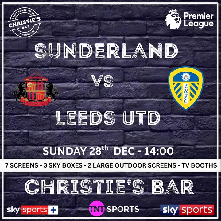 The festive football continues today 📺 Sunderland vs Leeds Utd - 14:00 📺 Crystal Palace vs Spurs - 16:30 Both games live with full commentary 🔈 #christiesharrogate #christiesbar #drinkspecials #LiveFootball #PremierLeague #CheapAsChips #Bar #BucketOfBeer